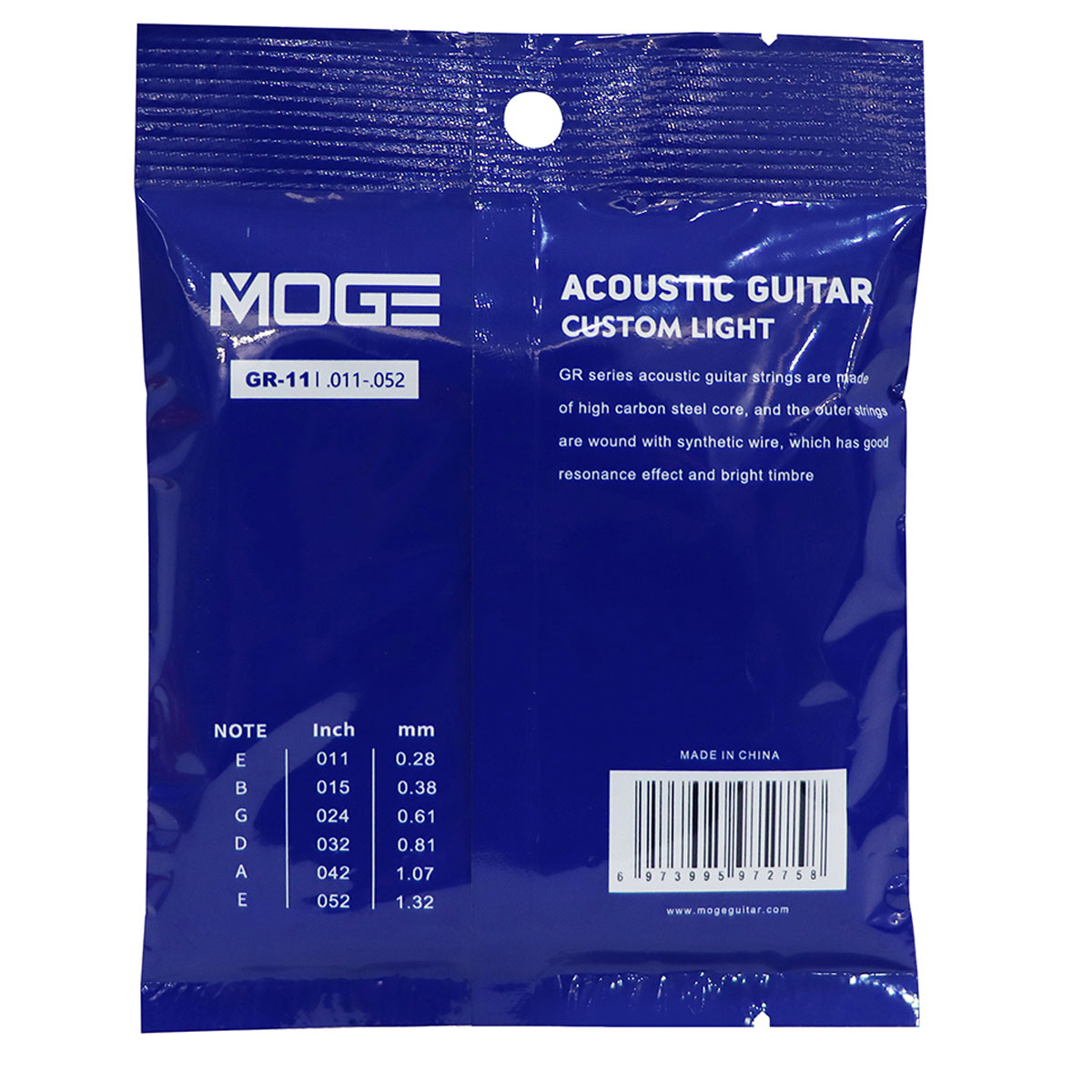 Dây guitar Moge GR-11 là dòng dây dành cho đàn Guitar Acoustic (đàn thùng dây sắt), nổi tiếng trong phân khúc giá rẻ dành cho học sinh, sinh viên và người mới tập.