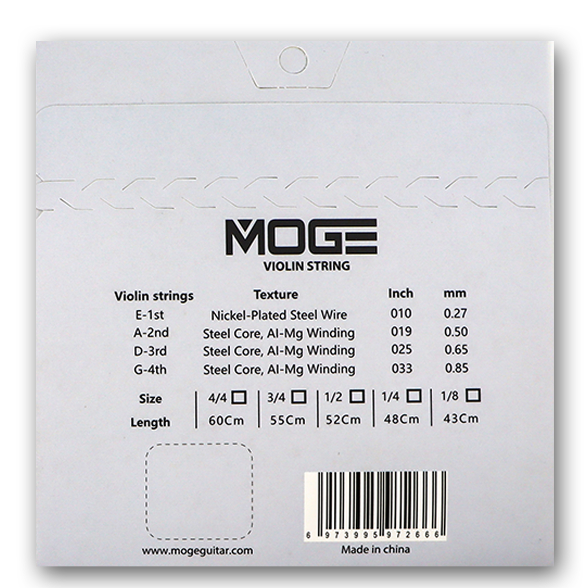 • Kích cỡ (Gauge): Thường có các kích thước tiêu chuẩn cho đàn 4/4, 3/4, 1/2 và 1/4.