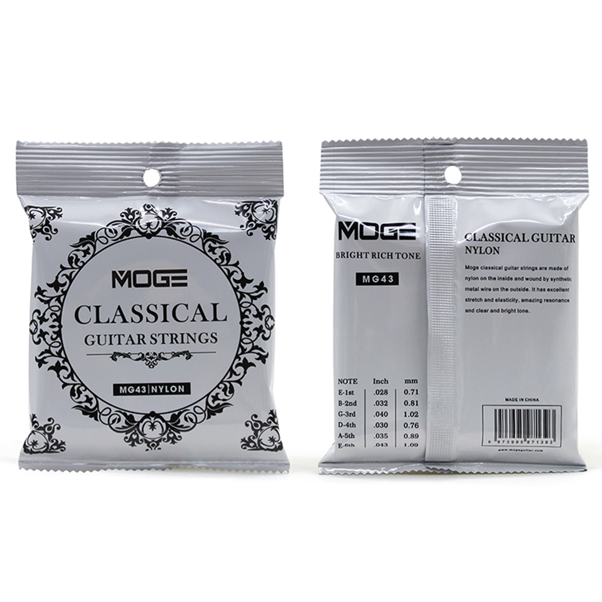 Dây Moge MG43 là bộ dây dành cho đàn guitar Classic (đàn cổ điển), không phải guitar điện như nhầm lẫn thường gặp. Đây là dòng dây phân khúc bình dân, rất phổ biến cho người mới tập nhờ cảm giác bấm êm tay và mức giá dễ tiếp cận.