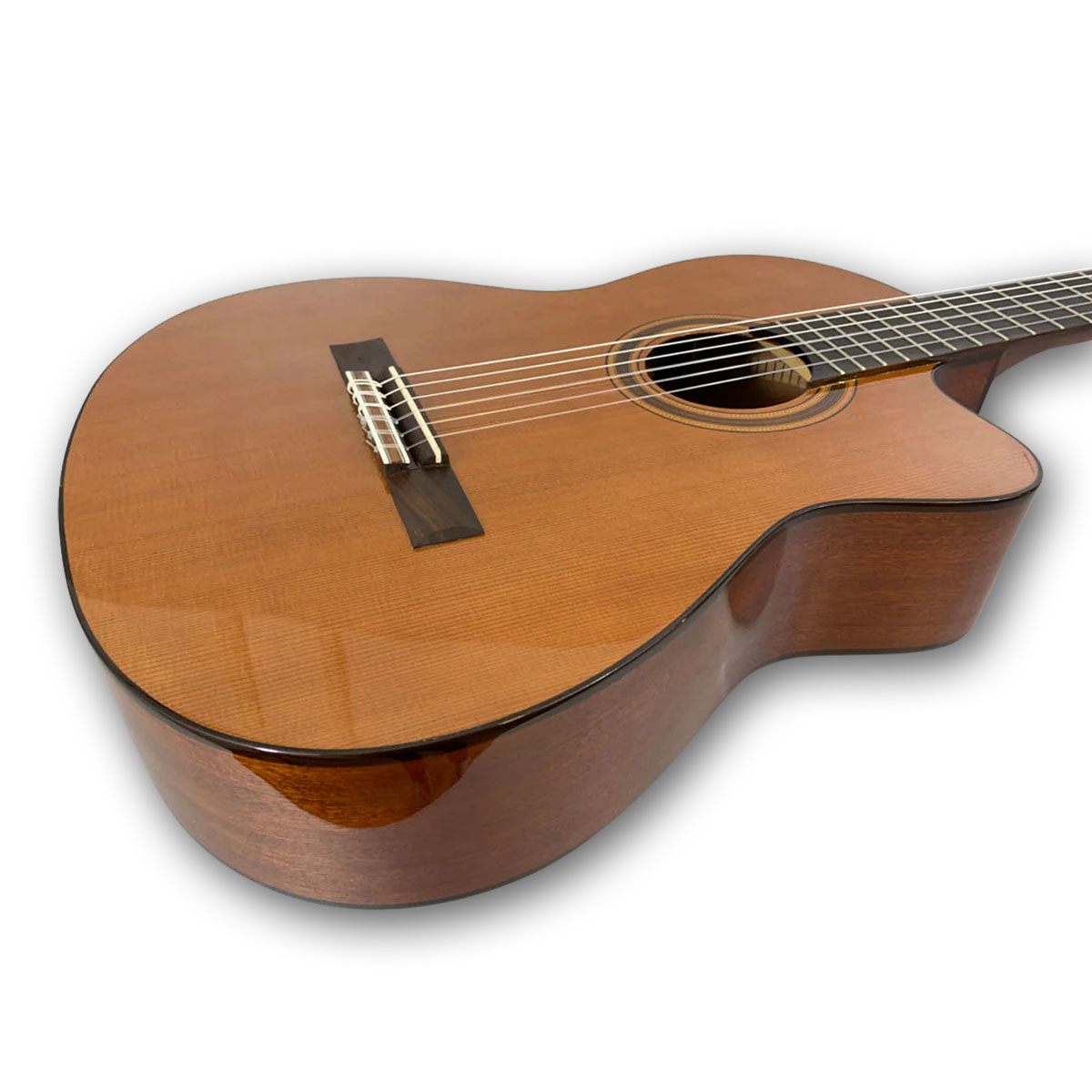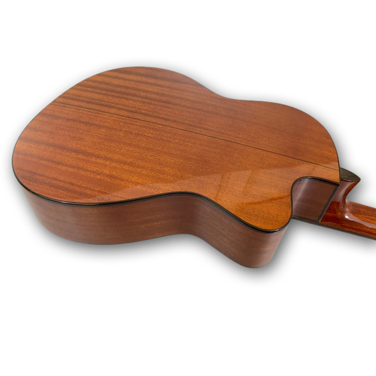 • Mặt trước (Top): Gỗ Tuyết tùng nguyên tấm (Solid Cedar), mang lại âm sắc ấm áp, sâu lắng và có độ cộng hưởng tự nhiên tốt.
